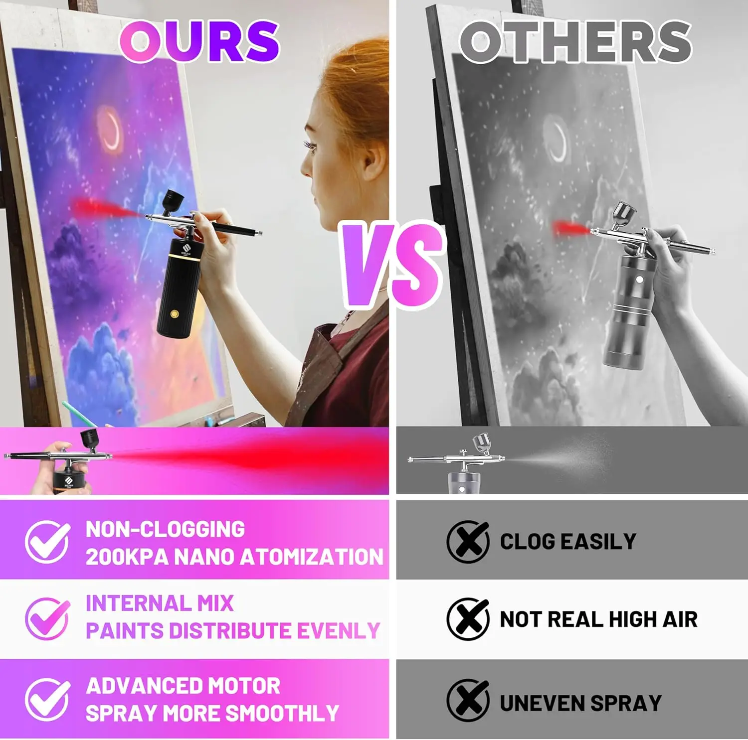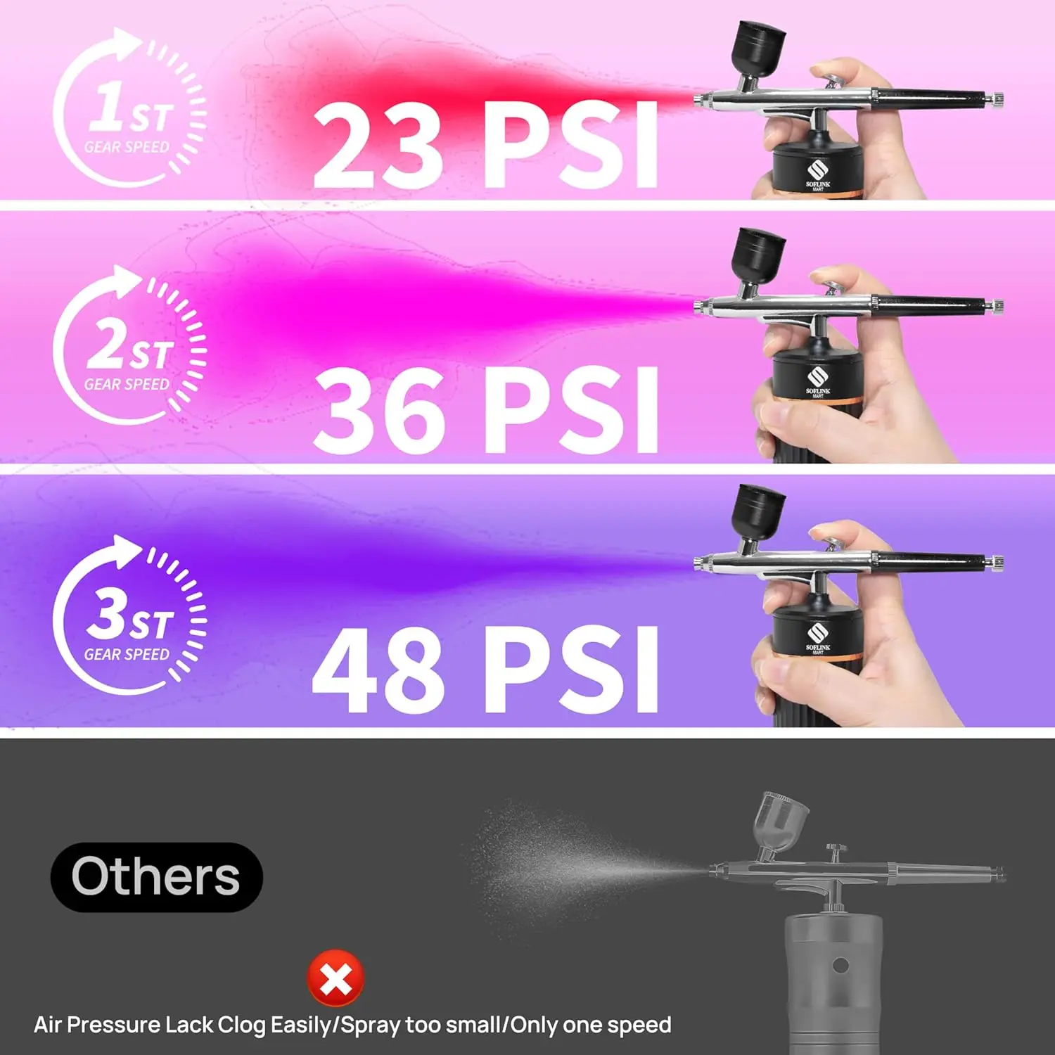 • Max Power, Zero Clog: Features 3 adjustable air pressures (23PSI, 36PSI, 48PSI)—significantly stronger than standard airbrushes to prevent clogging.